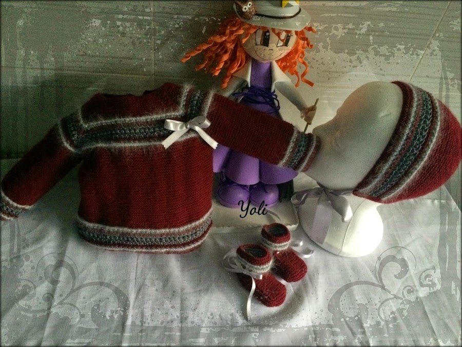 Tejido como siempre en calidades de primera, en un actual color granate, y esta vez decidi combinarlo con grises, el acero del prele y el perla de la angora.