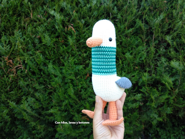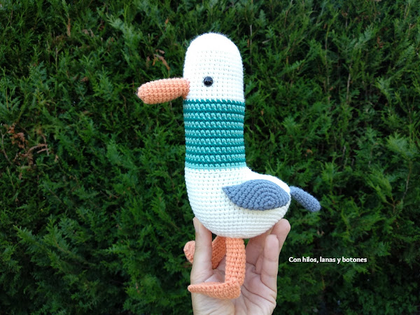 Alberto o Paco Gaviota está tejido con "Eco Luna" de "Valeria Lanas" (antes Valeria di Roma) y aguja de 3 mm. Lo tejí exactamente igual que indica el patrón e igual que el primero, peeeeero, el primero medía aproximadamente 30 cm y éste quedó un pelín más pequeño. No mucho, pero sí algo más pequeño, mide 25 cm. Misterios misteriosos de lo hecho a mano. Aun así, la clienta quedó contenta, y eso es lo único que importa.