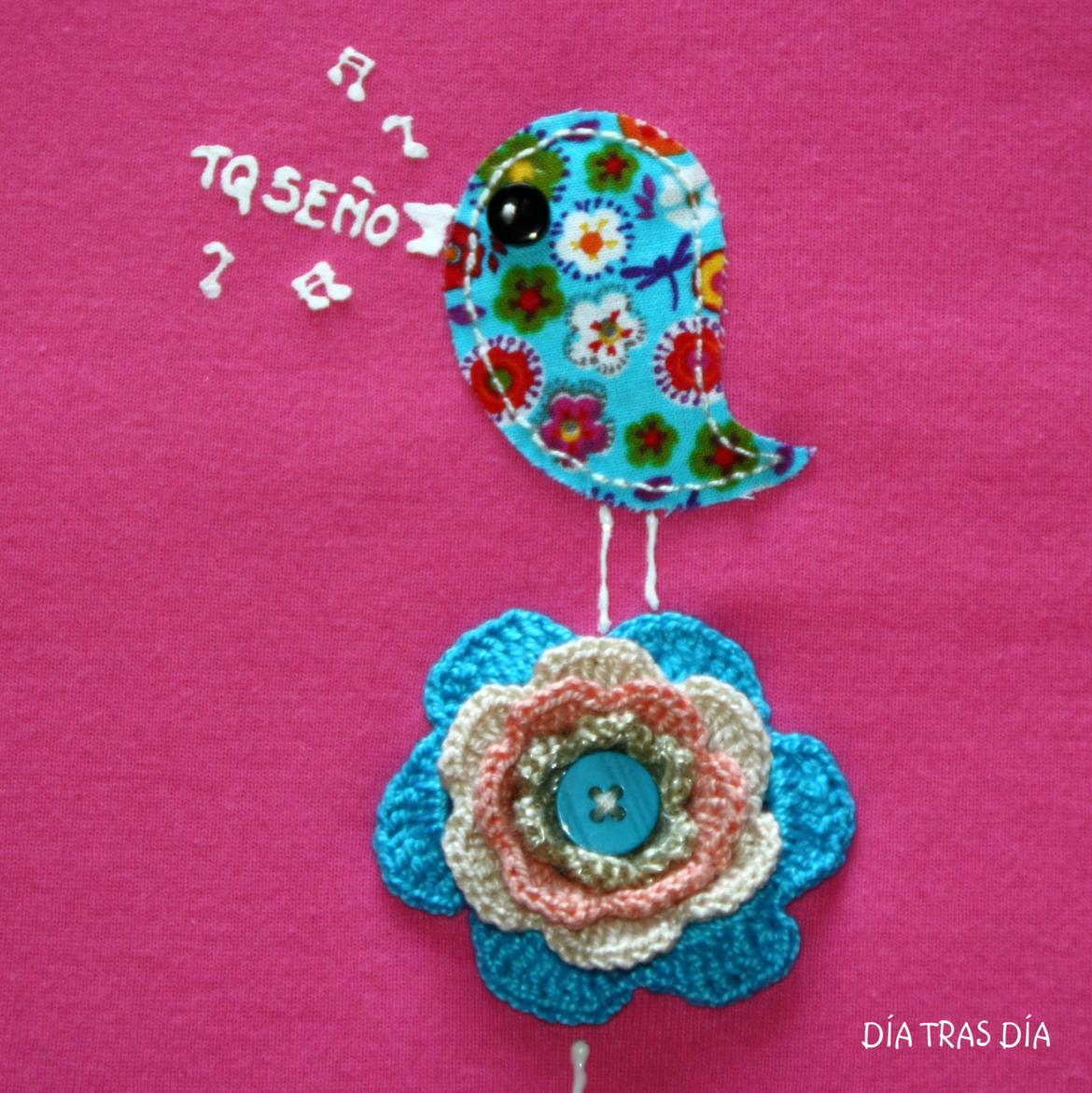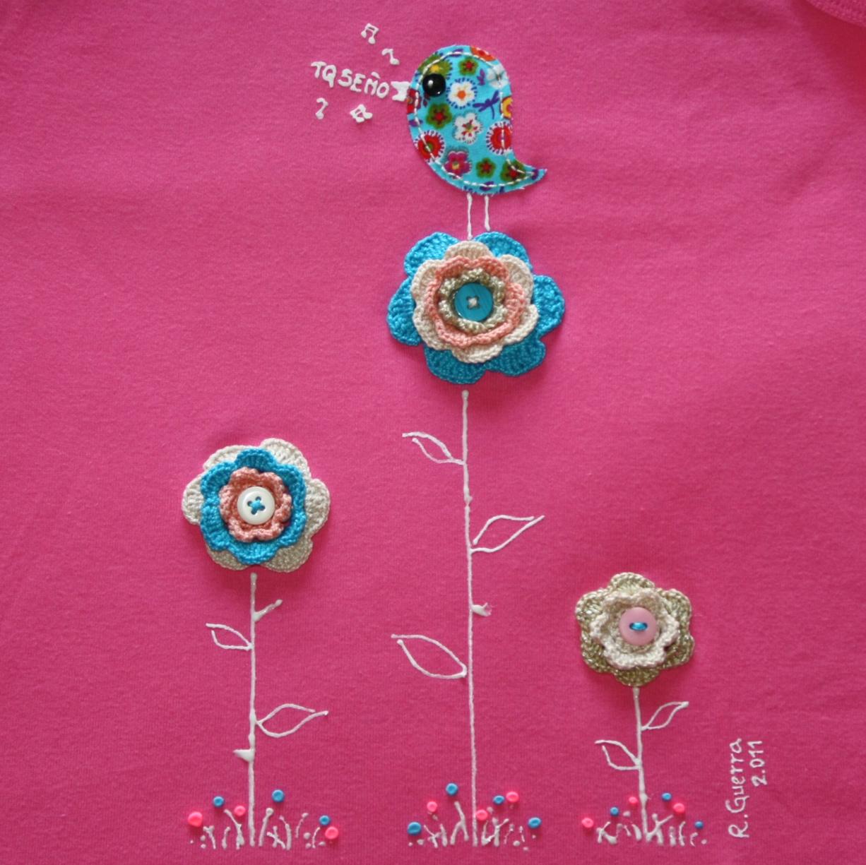 Yo sigo con mis camisetas cumpleañeras. Y como ya ha terminado el cole y los niños de momento ya no tienen más cumpleaños, para no perder la costumbre, he hecho esta vez una camiseta para regalar a Nuria, mi hermana, que mañana cumplirá añitos. Esta vez me he decidido por el diseño "Observando desde las flores", que ya fue el que elegí para regalar a Nora (su pequeña pulguita, como ella ...