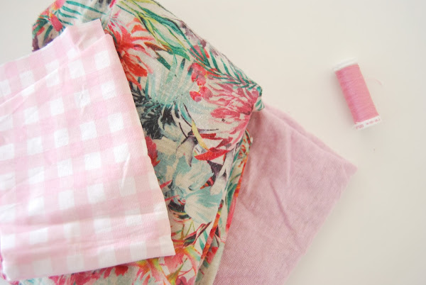 Y aquí los retales que en realidad no son exactamente retales, la tela rosa era una camiseta con mancha que iba directamente a la basura y la tela de flores, un pantalón gastado de mi hija. Pero como en esta casa nos gusta reciclar y reutilizar, han acabado siendo parte de este DIY. Porque muchas veces nos volvemos locos buscando telas, cuando buscando en el armario encontraremos un montón.