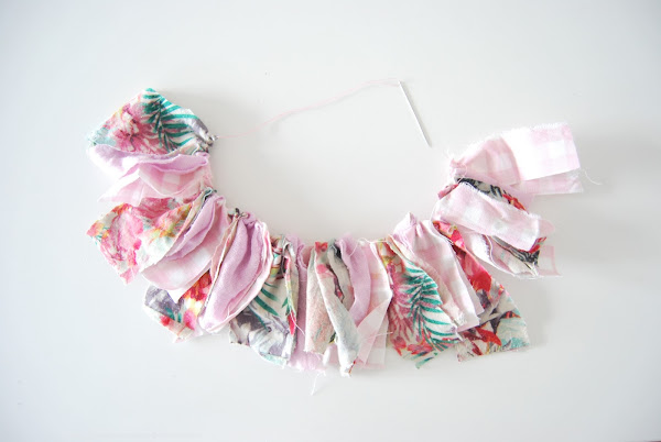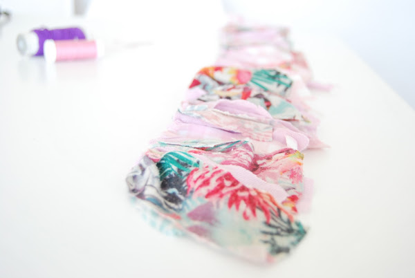 Y esta es la historia de cómo unos retales, se convierten en una guirnalda de flecos cosiéndolos con un poco de frunce (para esto no hace falta saber ni coser):