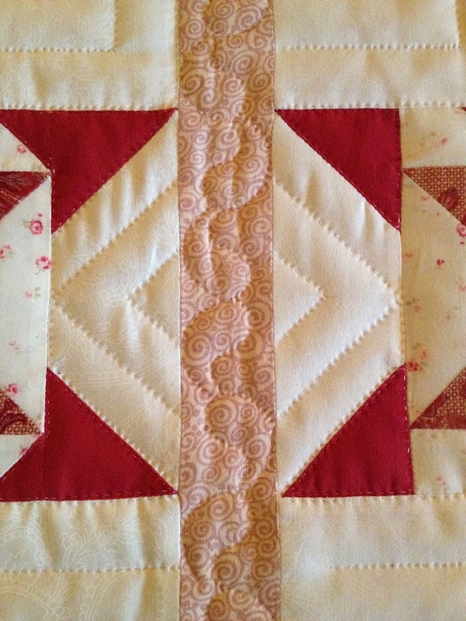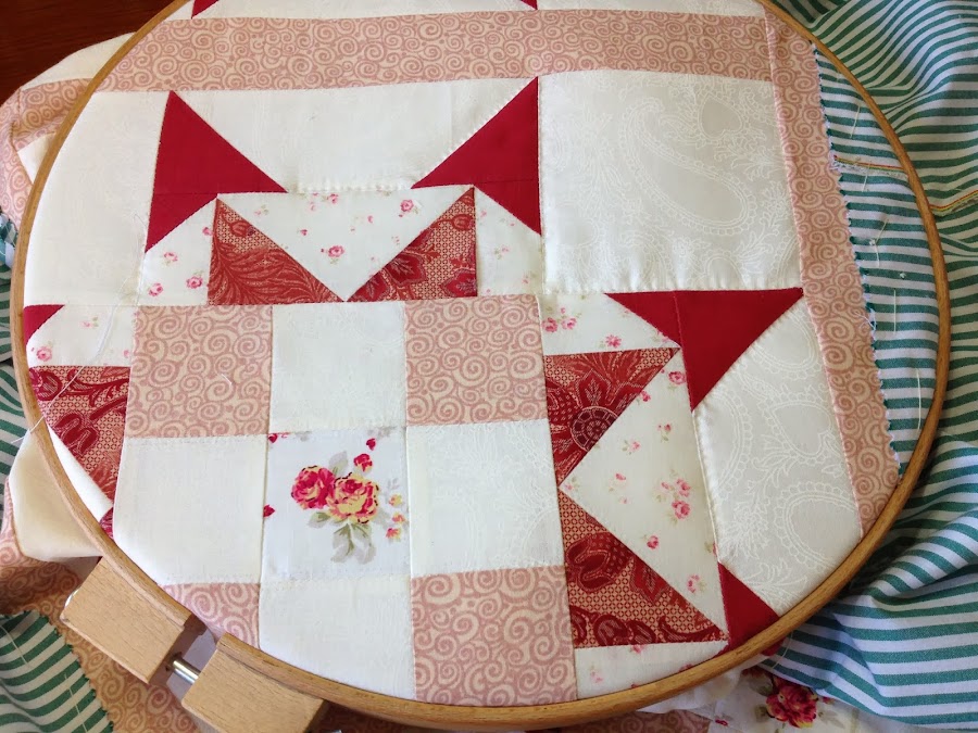Por la web encontré el bloque con el tutorial, y pensé que podría quedar muy bonito, y la verdad, el resultado ha sido muy satisfactorio para mi. Vi que los tonos de las telas me irían de maravilla en la mesa de mi comedor, así que intente escoger las telas que más se parecían. También os quiero decir que es el primer trabajo que acolcho a mano.