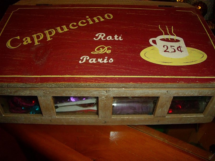Es una cajita para guardar el te y el café, pero sus compartimentos tienen el tamaño justo para los botes de lentejuelas.