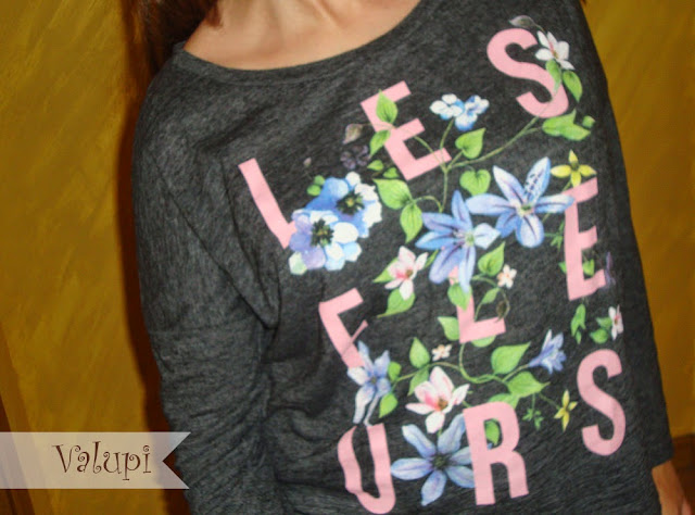 La combinación de los vaqueros en color rosa claro con una camiseta de manga larga gris con las letras "Les fleurs" también en rosa y llena de bonitas flores azules nos encanta ¡hay que darle un poco de alegría al otoño!