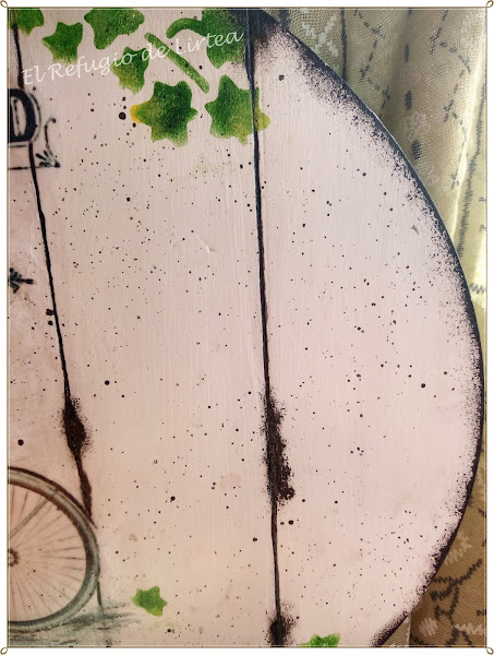Antes de pegar el transfer, pinté con pintura tipo chalk en color blanco roto todo el ovalo de madera y una vez seco con pintura negra acentué las divisiones y realicé un esponjado todo alrededor.