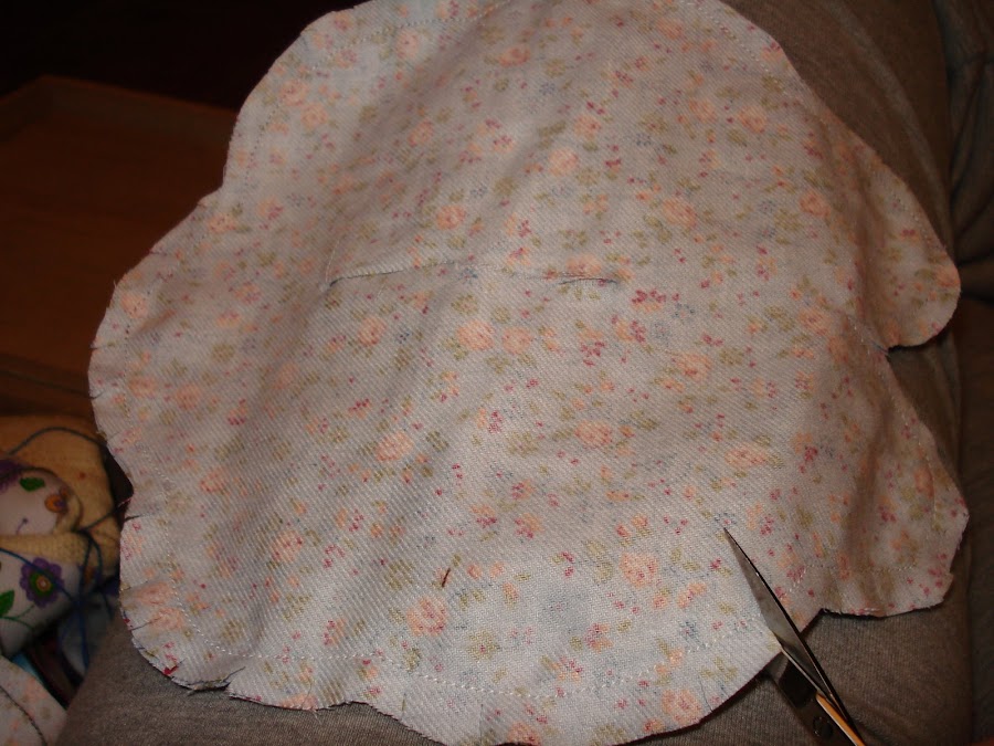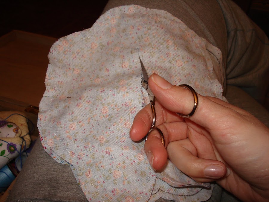 4º hacemos un corte en la parte central del molde del cuerpo, una vez que este cosida, por hay daremos la vuelta al cuerpo y rellenaremos después de guata, pero antes de rellenar hay que hacer unos cortes alrededor (sin llegar a la costura) para que al dar la vuelta no se deforme. Hacemos lo mismo con la parte que va sobre la cabeza