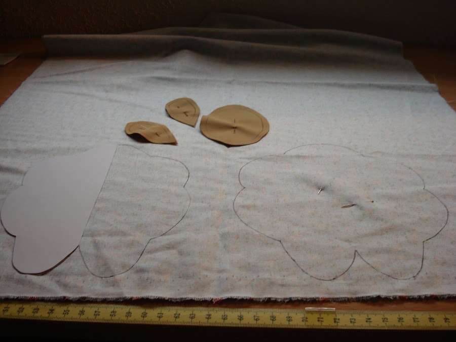 1º Recortamos los patrones y los pasamos a la tela, que debe ser doble.Teniendo en cuenta de dejar siempre 4 ó 5 mm de ancho mas de la marca para luego coser.