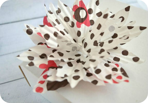 Ya solo queda doblar hacia arriba cada una para darle volumen y forma de flor y lista!!! Colócalas encima de tu regalo y mira como luce y lo que sorprende a quien lo reciba.