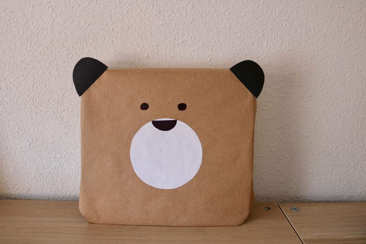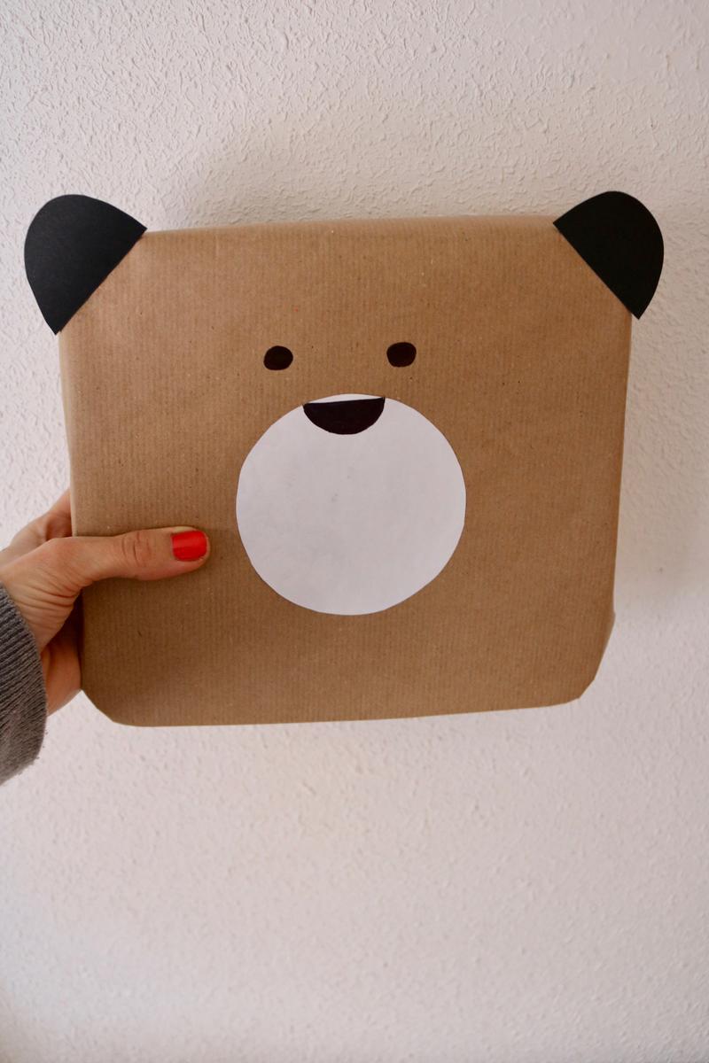 Hacerlo es muy sencillo; sólo es cuestión de envolver el regalo con papel kraft y luego con trozos de papel/cartulina blanca y negra hacer el resto de la carita del oso.