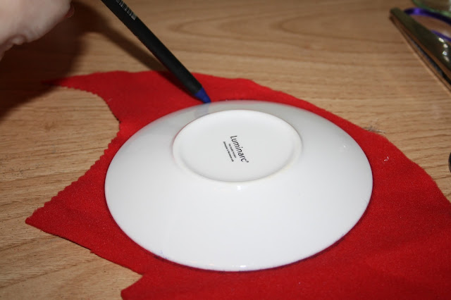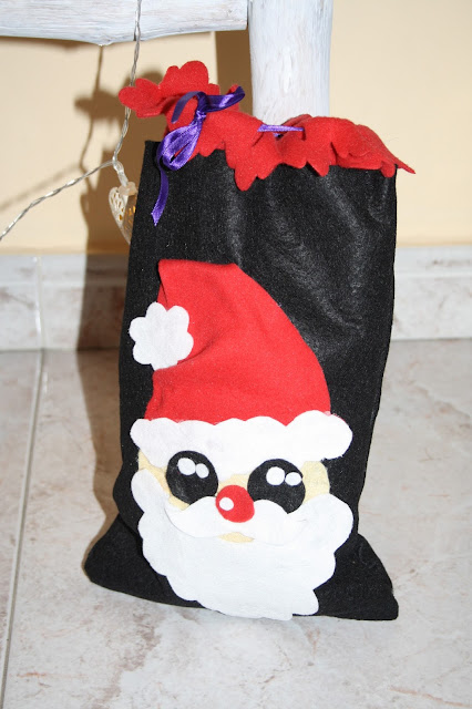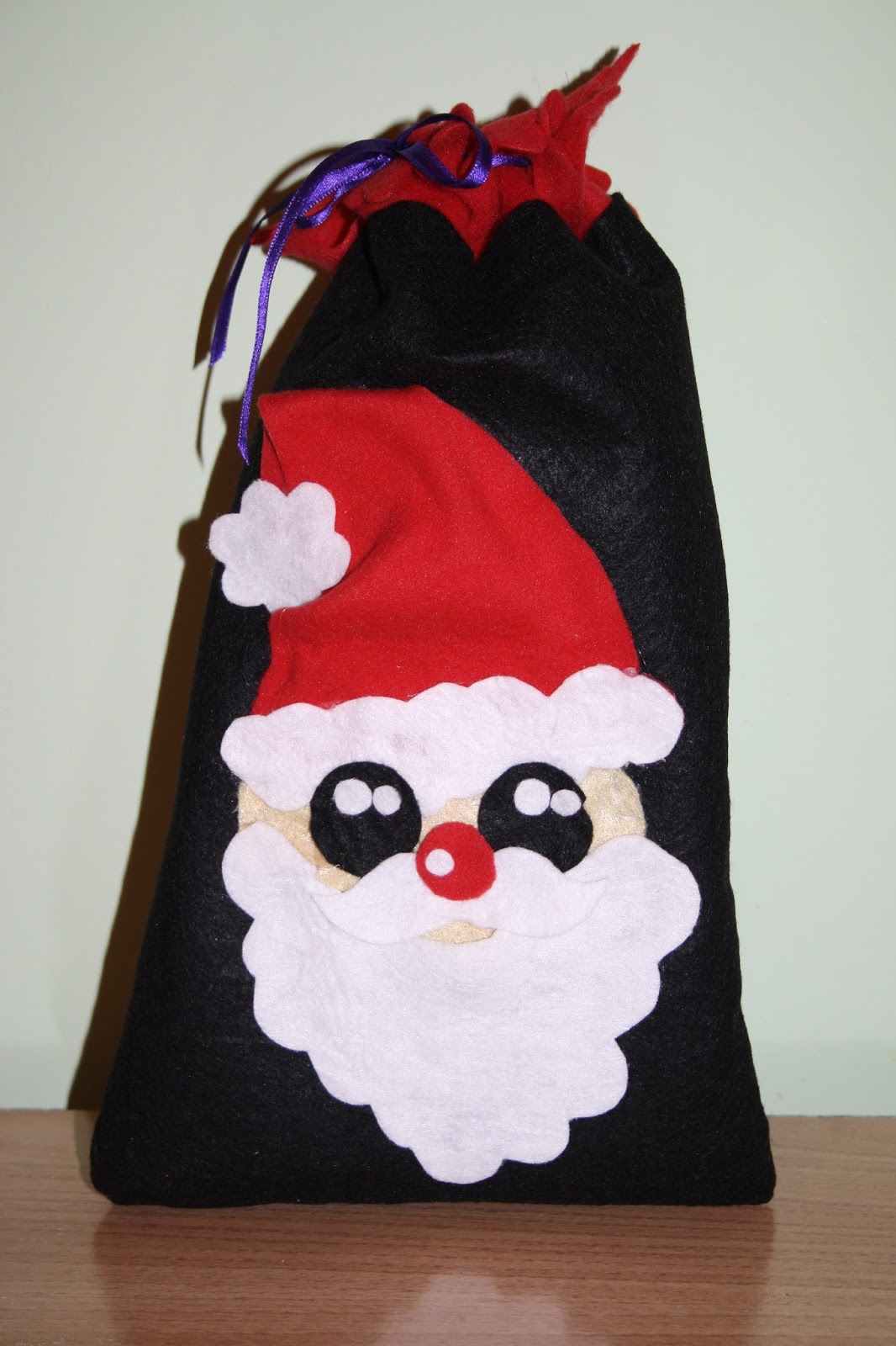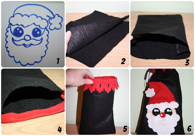 Dibujamos el motivo de nuestra bolsita y sobre el dibujo, recortamos el fieltro y "construimos" la imagen. Después pegamos dos rectángulos de fieltro del tamaño que queráis y dejamos una abertura en la parte superior. Yo adorné el cierre con una banda y después ya podemos atar el lazo a nuestra bolsa navideña.
