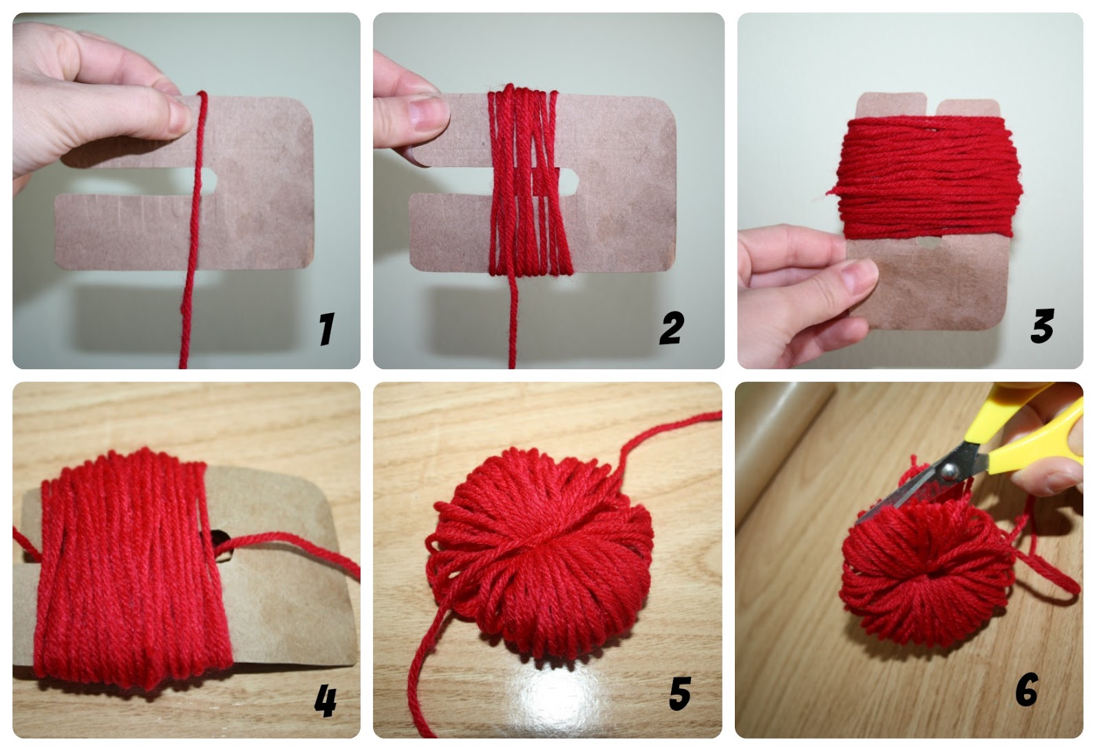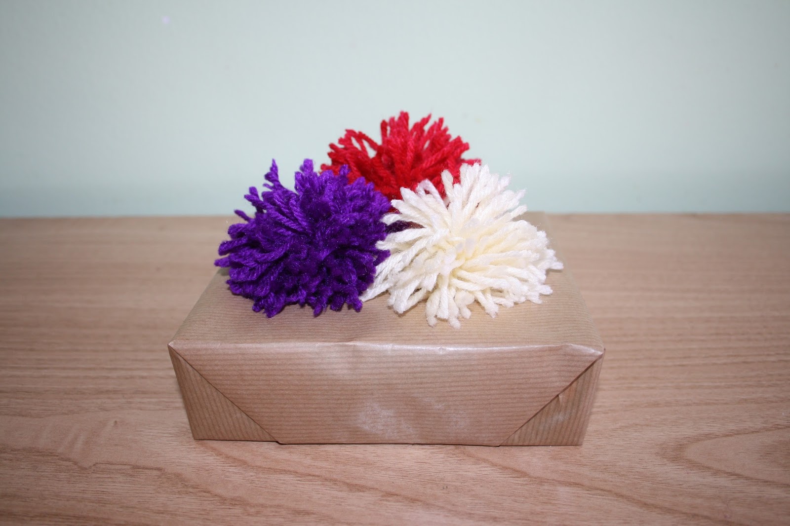Para hacerlos necesitamos un trozo de cartón, tijeras, pegamento y lanas de colores. Empezaremos cortando el cartón en forma de "U". Iremos enrollando la lana alrededor del cartón hasta tener un ovillo pequeño y con un hilo de lana, ataremos desde un extremo al otro para unir las dos partes. Cortamos la lana como se ve en la foto y si acaso, recortamos el pompón para igualarlo. Después, está chupado: pegamos los pompones al regalo y listo.