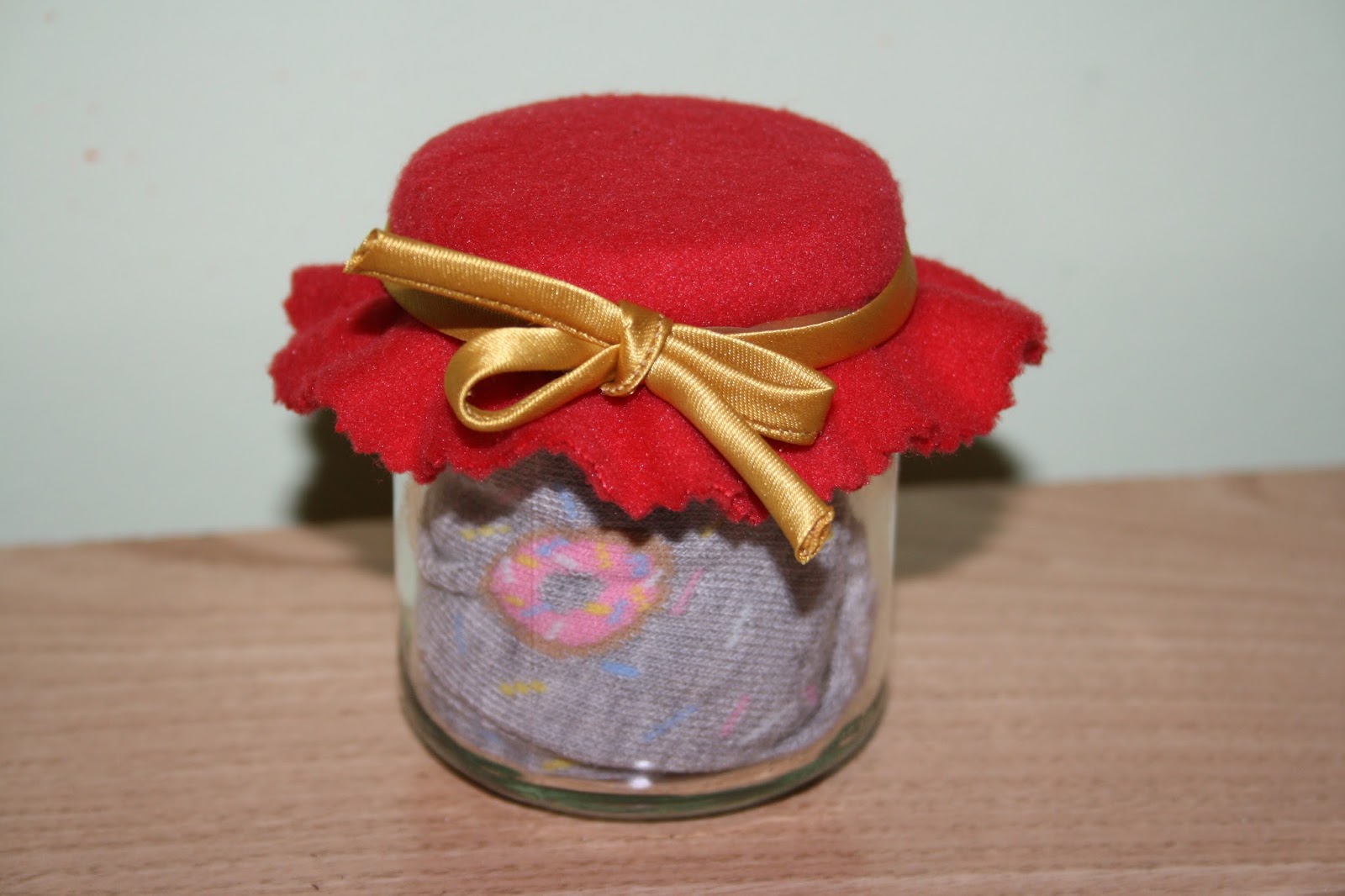 Necesitamos un par de tarros, fieltro, un par de gomas y lazos de colores. Adaptar vuestro regalo al tipo de recipiente que tengáis y usad la imaginación para decorarlo como más os guste: cintas de encaje, pintura, etiquetas navideñas, etc.