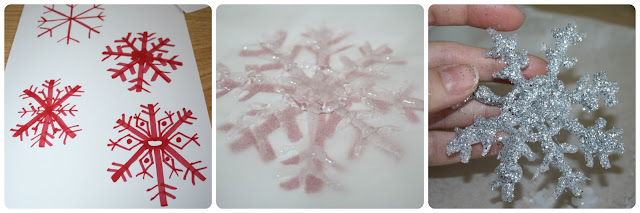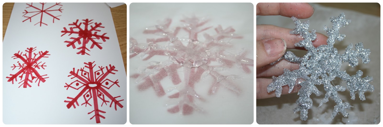 Dibujamos los copos de nieve en un folio, lo cubrimos con el papel de horno y dibujamos con la pistola de silicona por encima. Según vamos usando la pistola, echamos la purpurina por encima y así, obtendremos un copo de nieve. ¿Veis que fácil?
