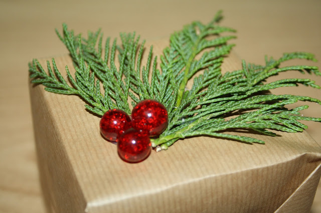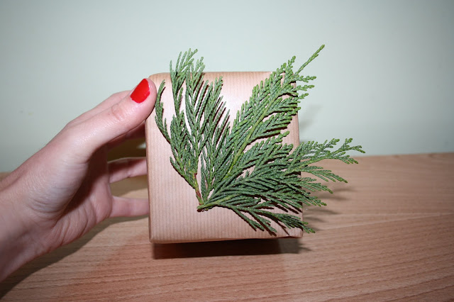 ¿Qué puede haber más navideño que las ramas de un pino? Decora tus regalos con ramitas de pino y si quieres puedes pegarles unas bolitas rojas al lado, como he hecho yo.