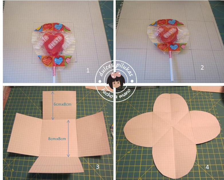 1- Tomamos la medida con la piruleta, ( he recortado un poco el celofán que envuelve la piruleta) hacer un cuadrado de 8x8