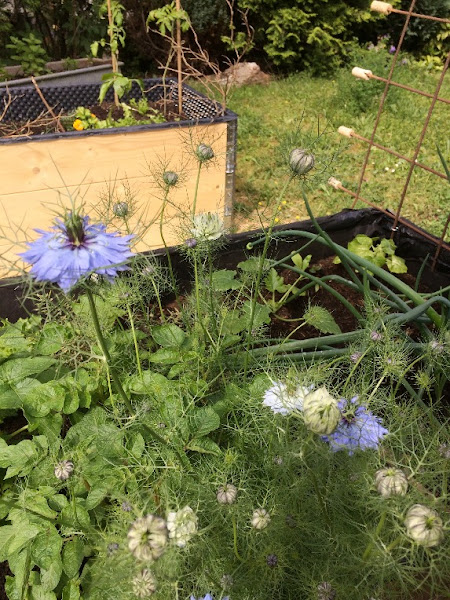 Algunas Nigellas (Nigella sativa - comino negro) salieron de sorpresa en mi huerto y decidí dejarlas sobre todo por sus flores, es que las tengo en la parte delantera de la casa, pues volaron a la trasera y llegaron al huerto... ahora se que sus semillas son comestibles!