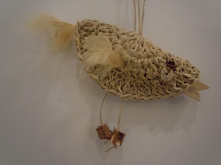 El ovillo es rustico, tanto el ojo como las patitas son de una rama de vid, el pico es una horquilla para colgar ropa y plumas para las alas y cola.