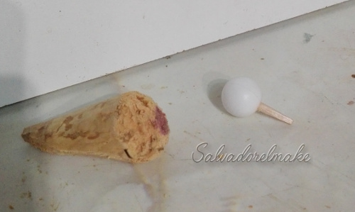La bola se taladra con una broca fina, dos agujeros a noventa grados mas o menos entre si; en cada uno de estos taladros ponemos una punta de palillo, uno hará de pico y el otro de cuello que clavaremos sobre el cuerpo. Es mejor siempre hacer un taladro previo donde vayamos a clavarlo y ponerle una gota de cola para que quede fijo.