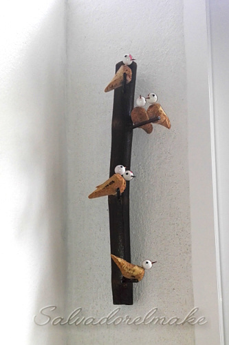 Una vez montado el pájaro pintamos (o no según gustos) el pico, los ojos y algún detalle para darle más vistosidad, una mano de barniz protegerá el trabajo y le da un acabado muy bueno.