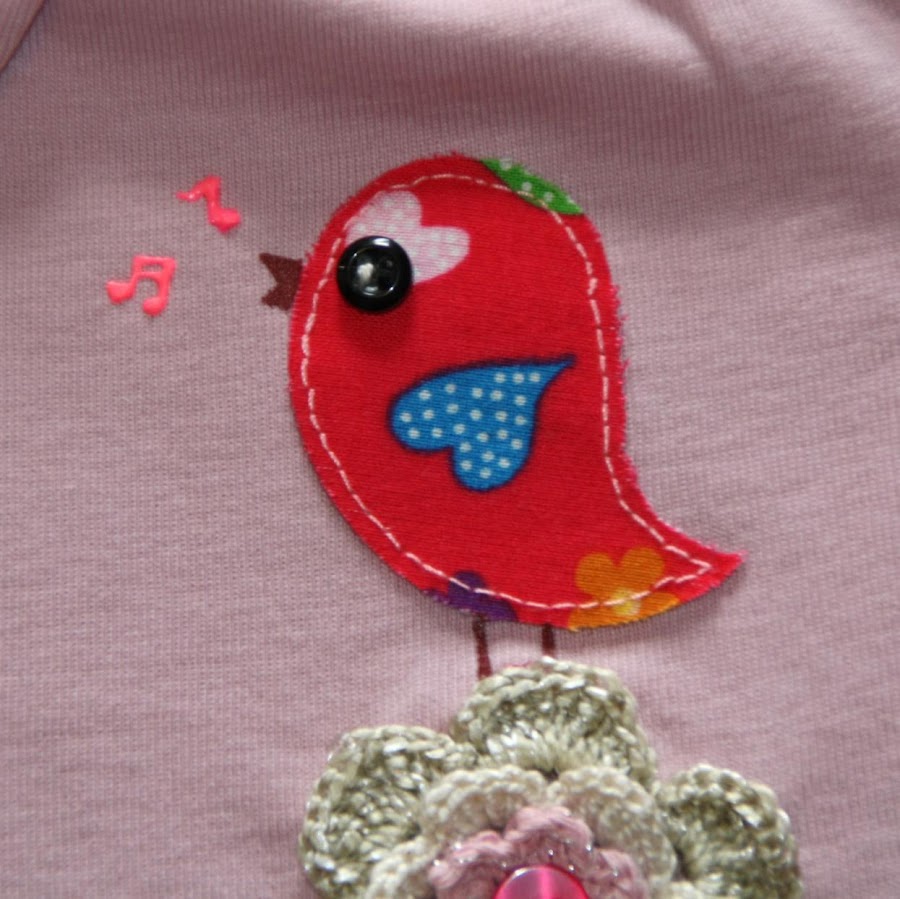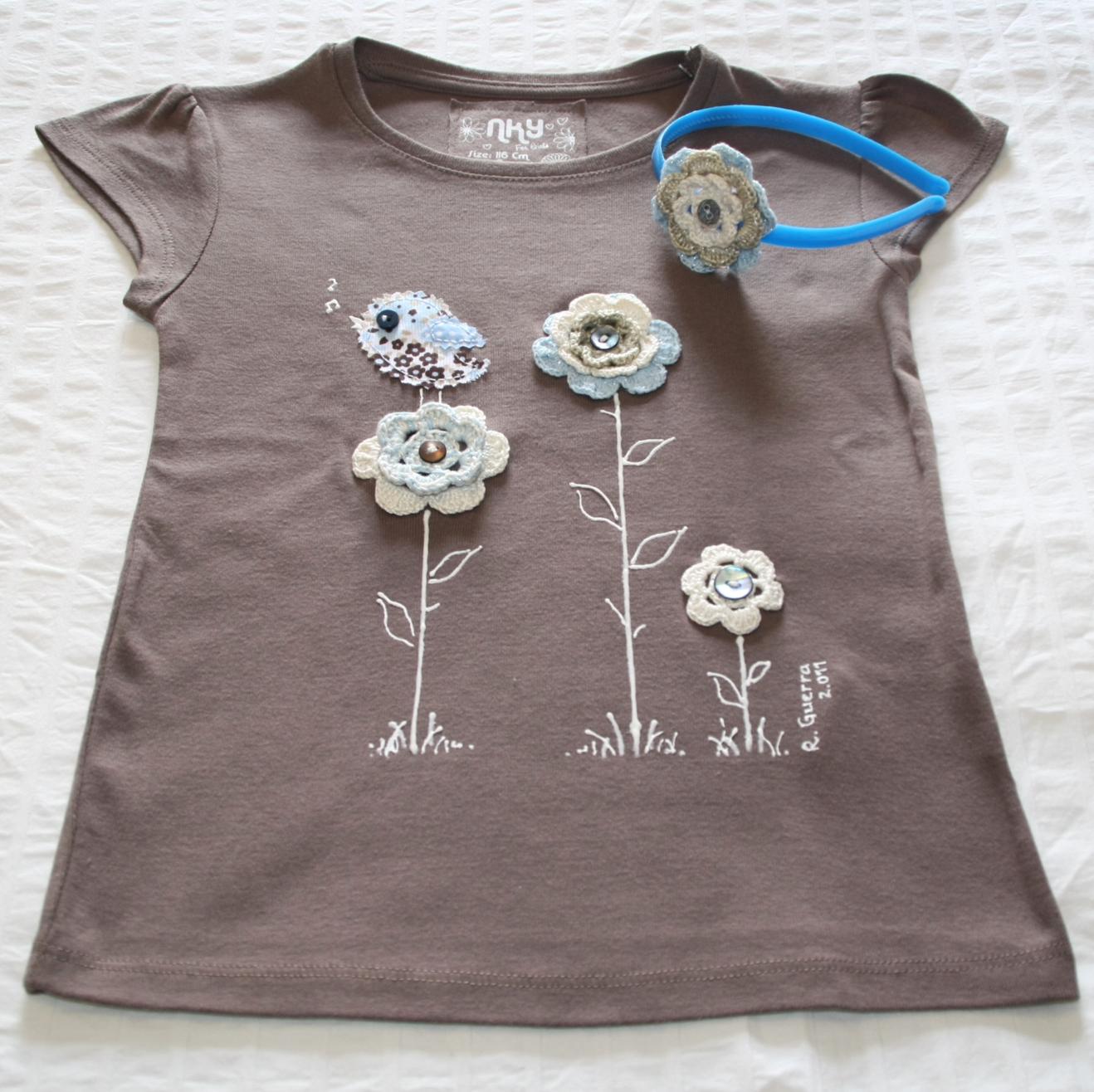 CAMISETA "OBSERVANDO DESDE LAS FLORES" DETALLE DE DIBUJO DETALLE DE PÁJARO Y FLORES DETALLE DE PÁJARO DIADEMA A CONJUNTO CON CAMISETA DETALLE DE FLOR DE CROCHET DETALLE DE TERMINACIÓN TRASERA CONJUNTO CAMISETA+DIADEMA