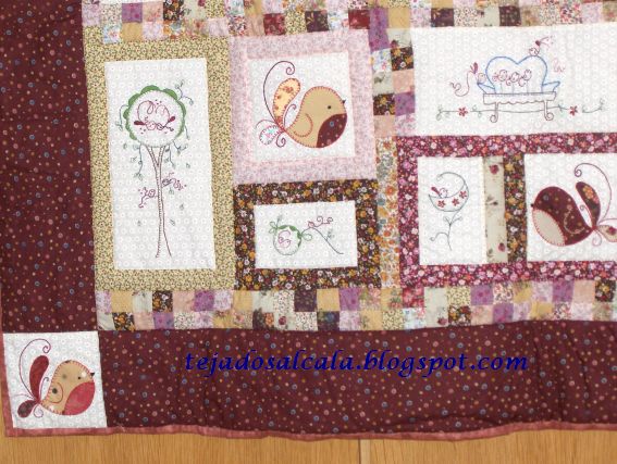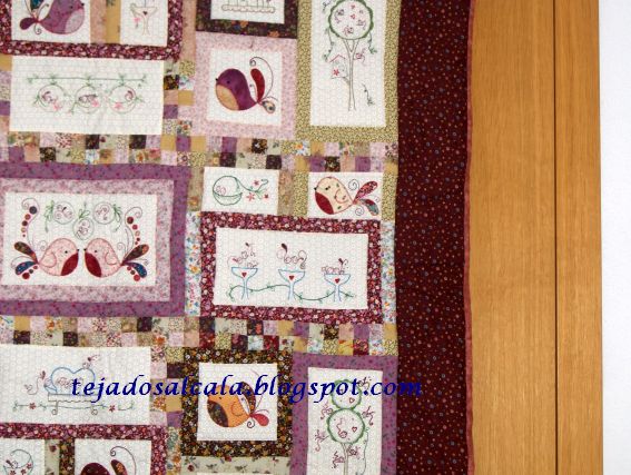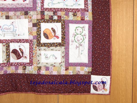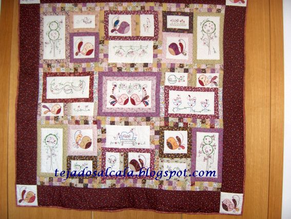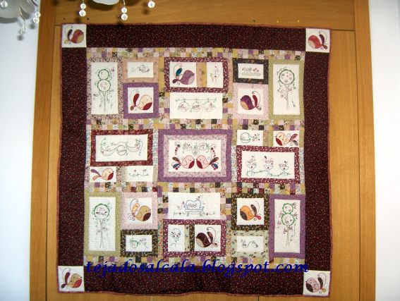 Hace ya dos años que comencé a hacer este quilt con las chicas del grupo de Patch. Dos años de cogerlo con muchas ganas y después abandonarlo y vuelta a cogerlo de nuevo. Se había convertido en un Ufo hasta que decidí que ya era hora de terminarlo y aquí está. Está todo cosido y acolchado a mano, lleva bordados con festón, punto tallo y pespunte, el resto son aplicaciones a festón y mucha paciencia para unir tantos cuadraditos pequeños.