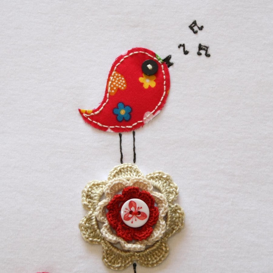 CAMISETA "OBSERVANDO DESDE LAS FLORES" BLANCA DETALLE DE DIBUJO DETALLE DE PÁJARO DE TELA DETALLE DE FLORES DE CROCHET