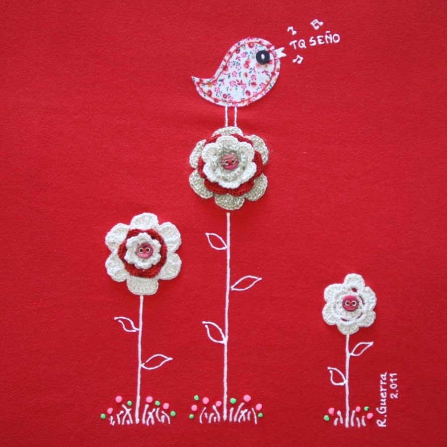CAMISETA "OBSERVANDO DESDE LAS FLORES" ROJA DETALLE DE DIBUJO Y TEXTO PERSONALIZADO DETALLE DE FLORES DE CROCHET