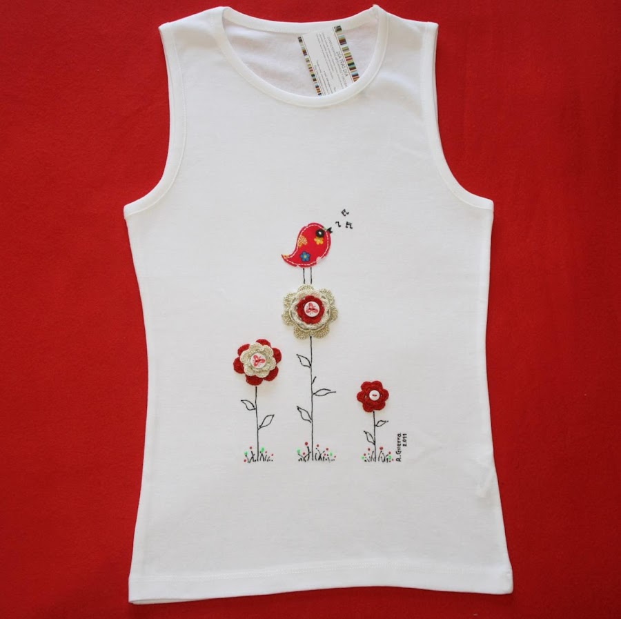 Y para la entrada de hoy, traigo dos nuevas camisetas que acabo de terminar para dos encargos que me habían realizado, las dos del modelo "Observando desde las flores". Una de ellas me la han encargado para hacer un regalito de fin de curso a una seño, y me han pedido que la personalice con un mensaje.