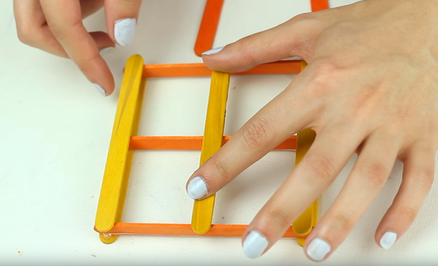 Coloca dos palos de forma paralela. Después coloca tres encima cruzados en la dirección opuesta. Mide bien las distancias para que quede un cuadrado.A continuación, pega los tres palos de la parte superior con silicona caliente. ¡Cuidado! Pégalos por el canto para que queden 'de pie'. ¡Mira la imagen!