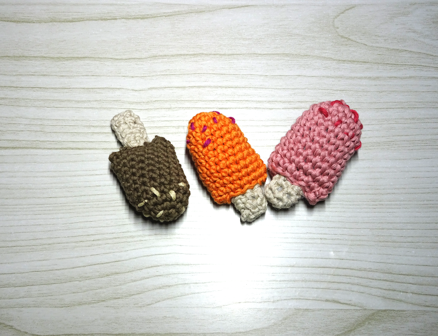 Una vez finalizado el largo del helado podemos decorarlo, podemos bordar virutas o incluso hacerle una carita. Si queremos podemos rellenar esta parte con algodón, guata, esponjitas..
