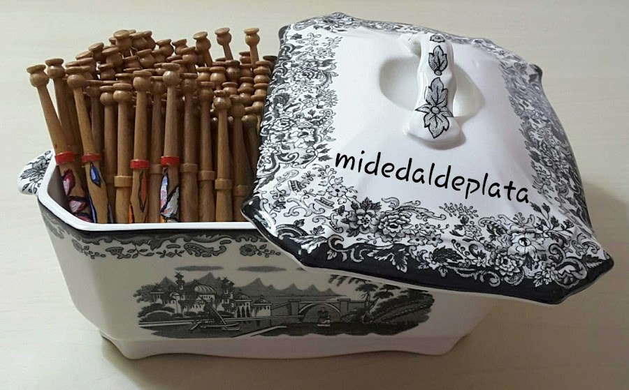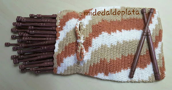 Bolillos en madera de Amaranto, de Carmelo Badalona, adquiridos en Hilaturas Sonia Juan. Bolsa de crochet en tres colores tejida por Merche GS.