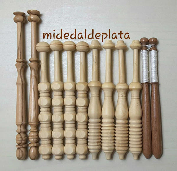 Como encajera de gusto tradicional y en constante aprendizaje, mi elección está influenciada por los elementos de siempre. Por eso, la mayoría de los palillos de bolillos que componen mi costurero son de madera, de diferente procedencia.