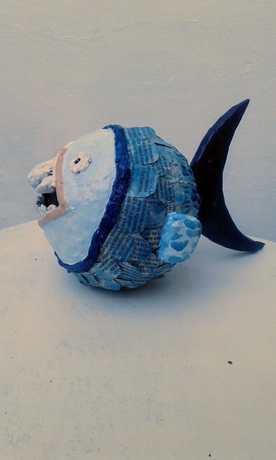 Pez realizado con cartapesta, detalles con papel machè y escamas hechas con periódicos