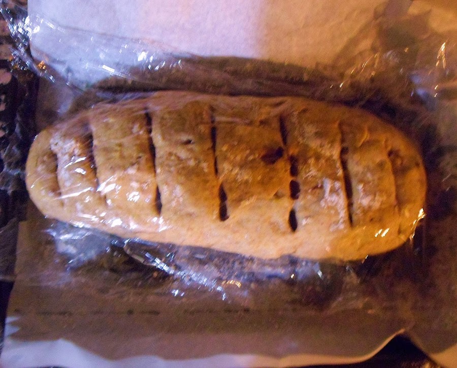 Amasamos por última vez y le damos la forma que queramos al pan. Colocamos en una bandeja de horno (hay que tener en cuenta que tiene que doblar su tamaño), cubierta con papel de horno. Le hacemos unos cortecitos en la parte superior de la masa. Volvemos a tapar y dejamos reposar otros 15 minutos antes de meterlo en el horno, que iremos precalentando a temperatura máxima.