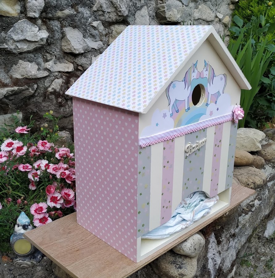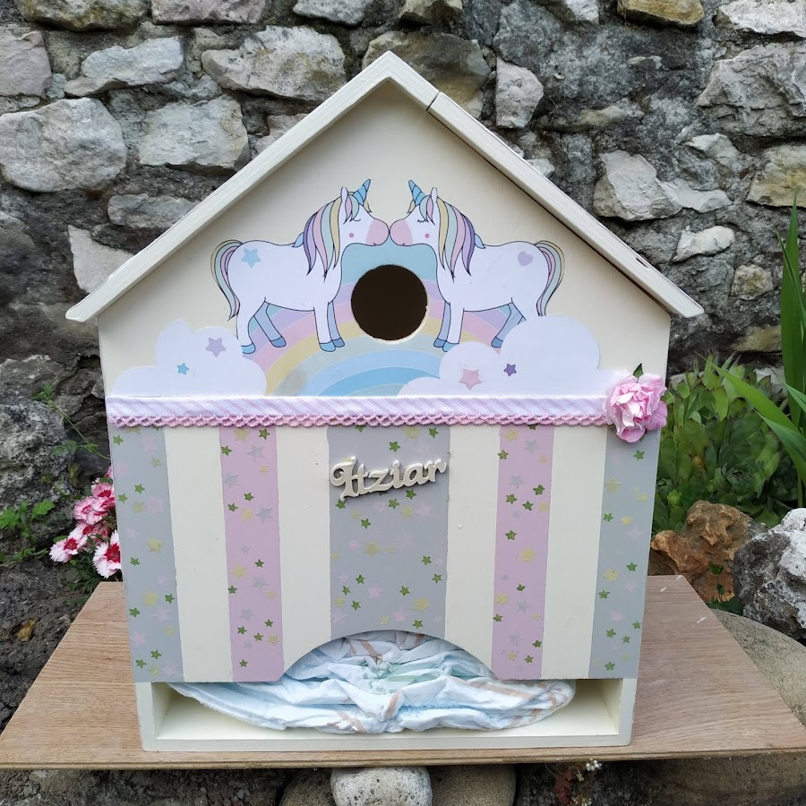 Aquí os traigo otra idea mas para regalar en el nacimiento de un bebé. Se trata de una pañalera con forma de casita que permite introducir los pañales por la parte superior (el tejado) y que también puede servir como decoración.
