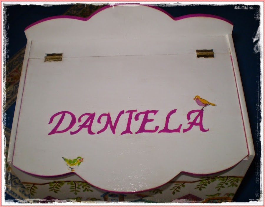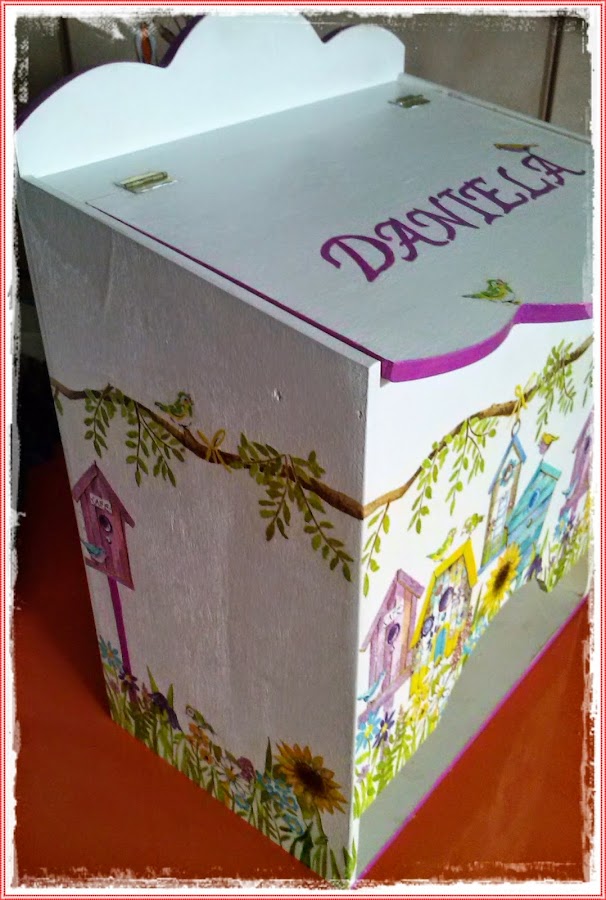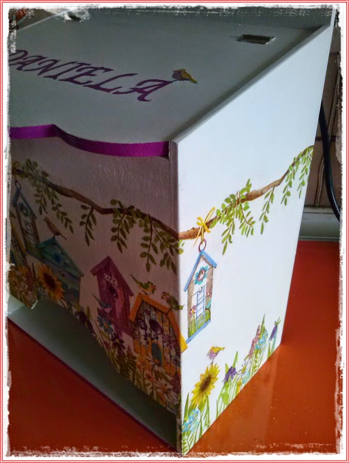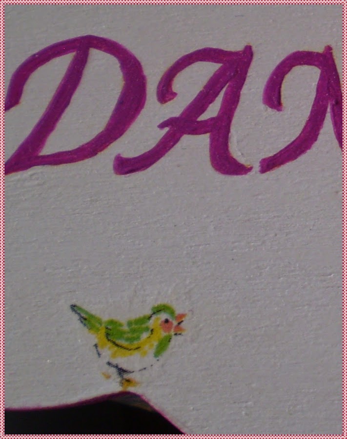 En la parte superior pinte el nombre de la recién nacida y le puse unos pajaritos de la misma servilleta.