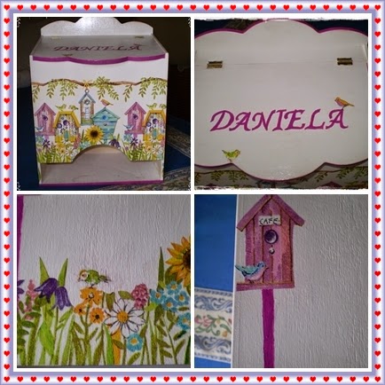 Como veis se trata de una pañalera de madera que he pintado y adornado con decoupage.
