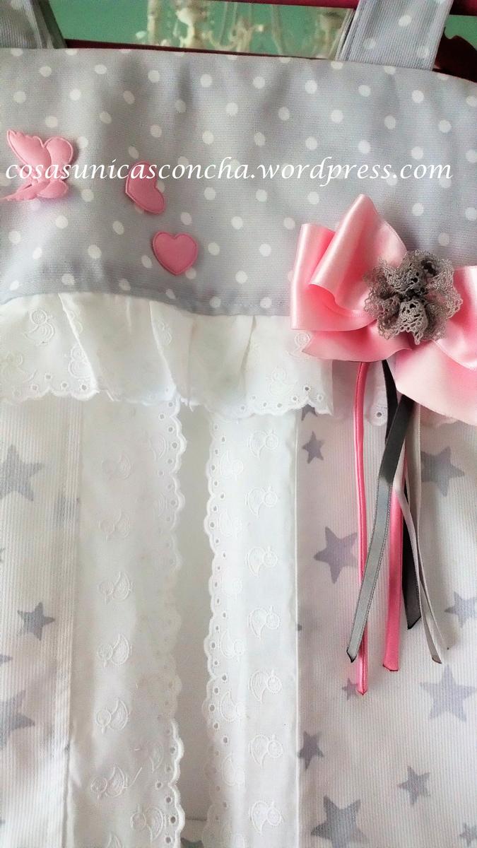 Este encargo me lo ha hecho una amiga, para regalarselo a una amiga suya, que ha sido abuela de una niña y quería que no fuese todo rosa, pero si algo fino y combinando estas, pensé que quedaría muy fina y bonita a la vez y con el toque del lazo rosa, pues el remate.