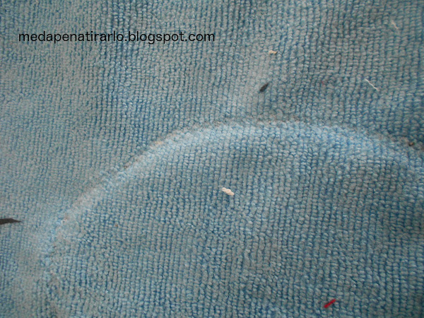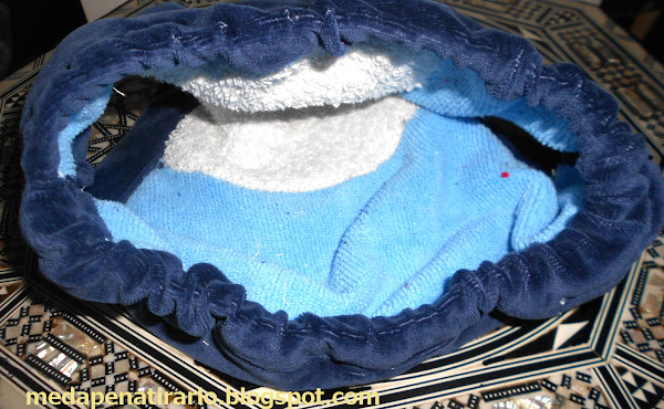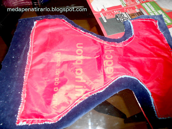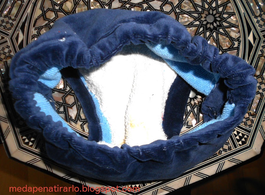 cualquier tela decente para que se vea por fuera, en mi caso, el inefable pantalon de pijama de tercipelo azul que tanta cancha me está dando (y todavía me sobra mucho material!!!)