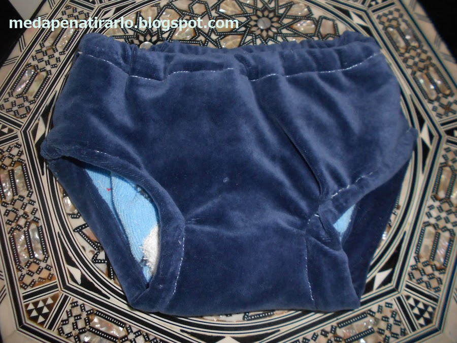 Yo solo puedo ofreceros un prototipo que no se ha usado, pero os puede dar una idea para realizar vuestro propio proyecto de braguita nocturna lavable, con elásticos para permitir la autonomía de niños que se saben bajar los pañales cuando les apetece (2-3 años), y reciclando materiales de andar por casa. No es muy cutre aunque haya sido un trabajo en balde, ¿no?