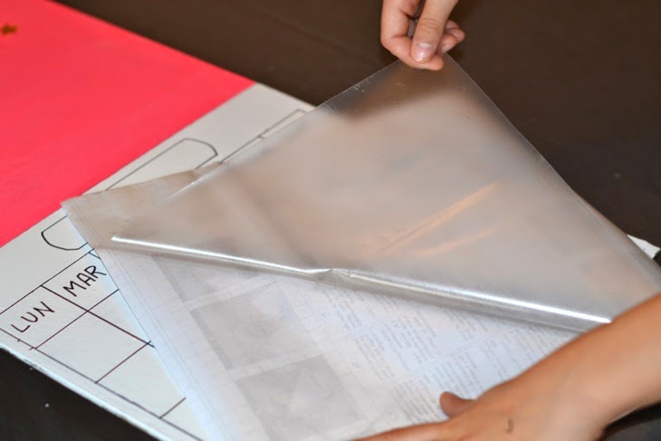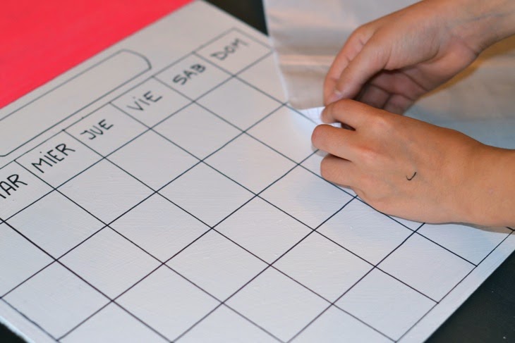 - Recortamos un cuadrado de aeronfix exactamente igual que este cuadrante y lo pegamos encima. Así podremos escribir encima con un rotulador de esos tipo veleda, y cada mes cambiamos los días de sitio y el nombre del mes. También podremos apuntar los diferentes eventos y actividades que no queremos olvidar.