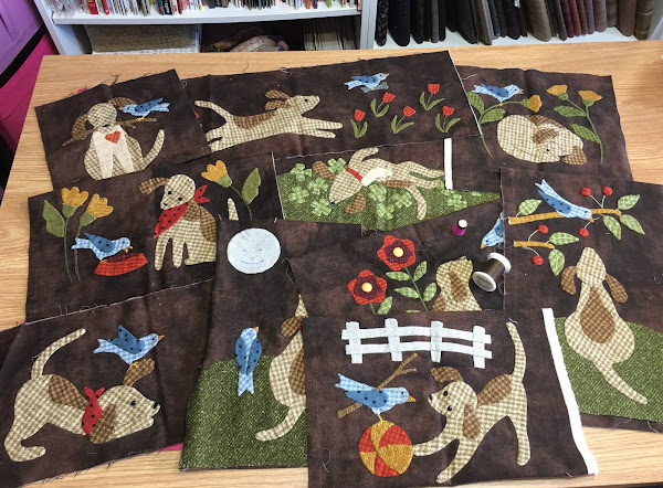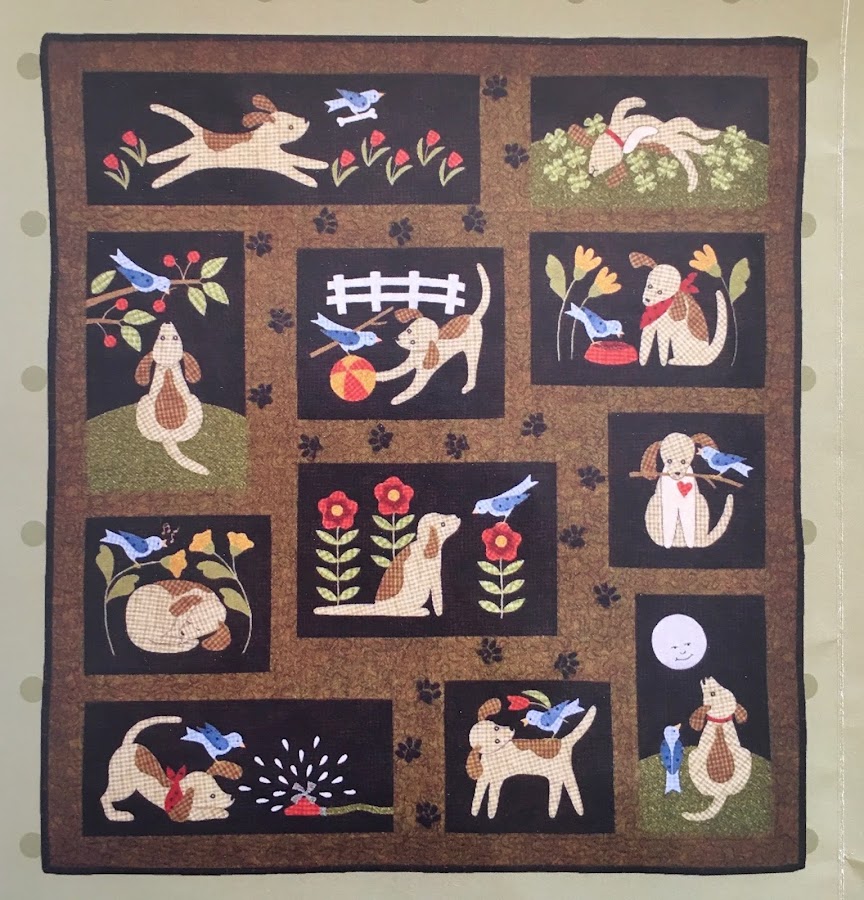 Panel Perritos de Shabby Fabric ( medidas aproximadamente 115 x 110 cm) consta de 11 bloques y una base de franelas. El kit lleva todo lo necesario para poder hacer el bloque: franelas, fiselinas, patrones etc.