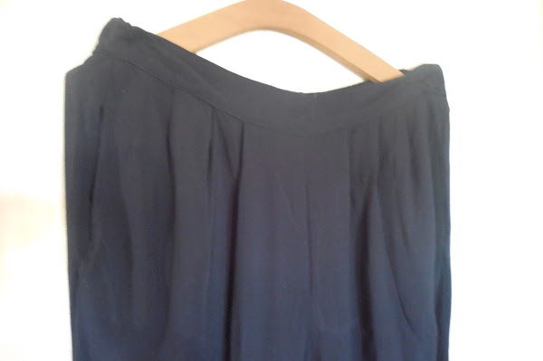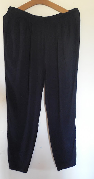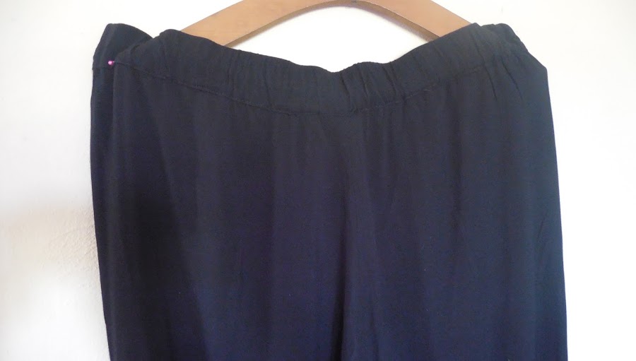 Es un pantalón con dos pliegues en la parte delantera y elastizado en la parte trasera de la cintura. Es holgado en la parte superior y mas ajustado hacia abajo; además tiene bolsillos laterales en las costuras.