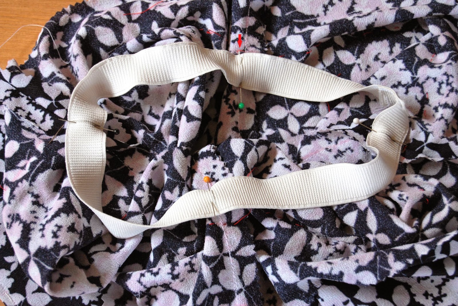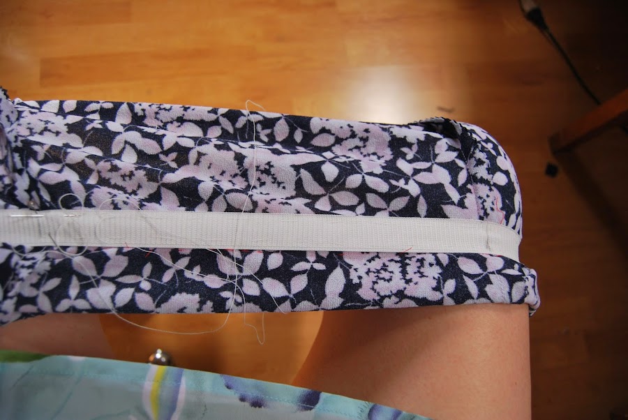 La goma debe ir situada a un par de milímetros por debajo de la línea marcada de la cintura que nosotras hemos marcado con unos hilos flojos para que pueda verse mejor