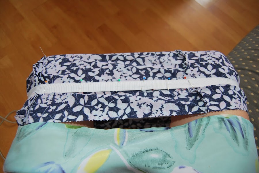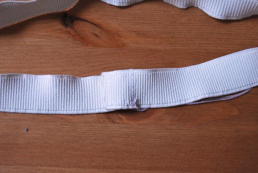 Ahora viene la parte algo más engorrosa: debes marcar la goma con una rayita/alfiler.... en 4 puntos de forma que te queden 4 partes iguales, que serán las que luego haremos coincidir con las 4 costuras: laterales y centrales.