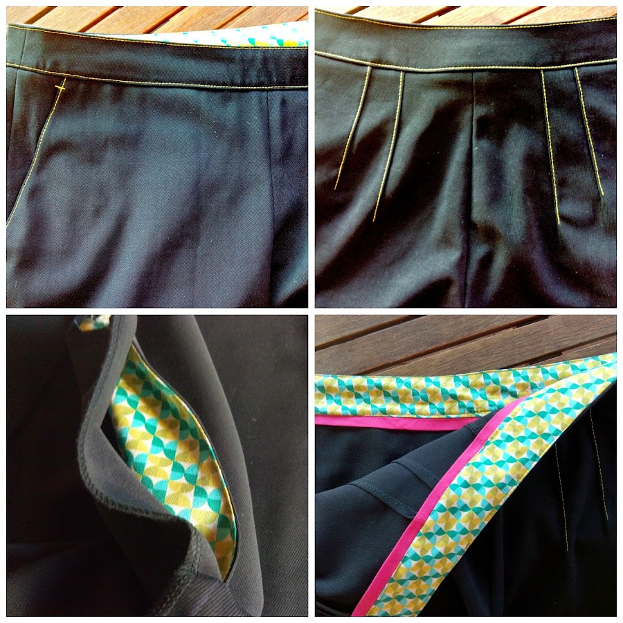 La tela negra un poco elástica es de Ribes&Casals y la estampada de Telaria. Llevan unos pespuntes de contraste a juego con la tela estampada. Como me gusta coser esos detalles!! Sobretodo los interiores que nadie más ve, pero yo sé que están ahí.