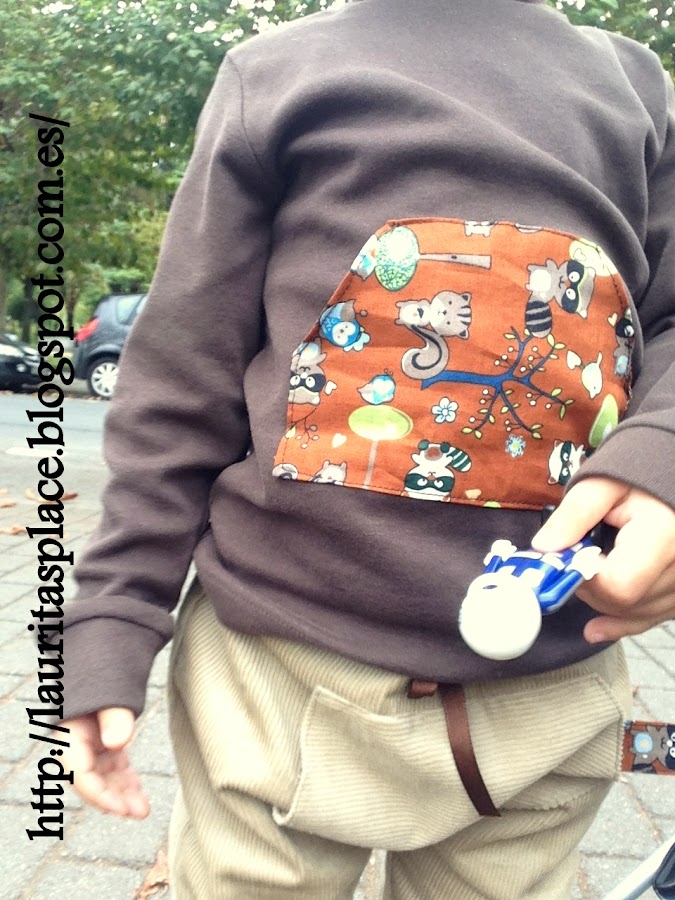 En la cintura le he puesto goma interior, y luego dos remaches para pasar una cinta y así poder ajustar mejor el pantalón. El bolso lleva un anilamito asomando que es de la misma tela que los apliques de la camiseta. Él dice que es Swiper el de Dora :).