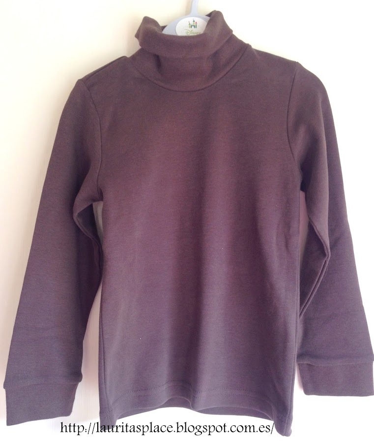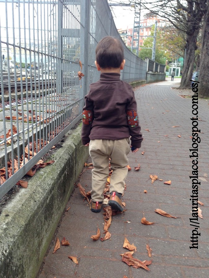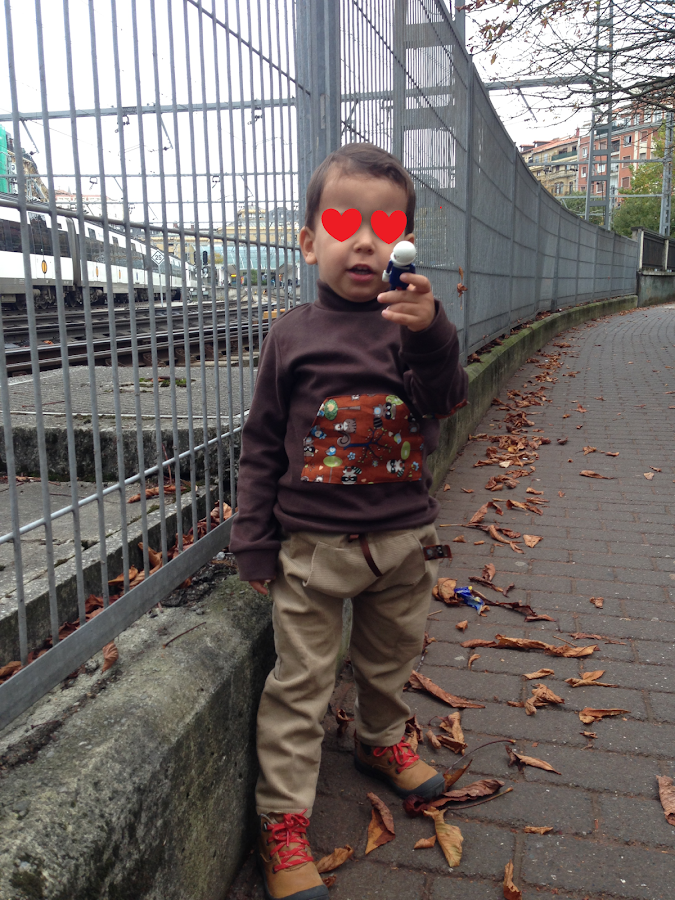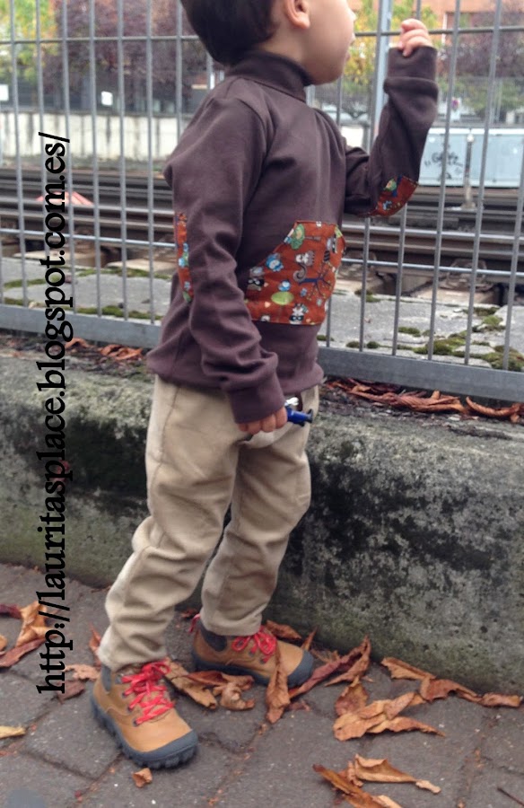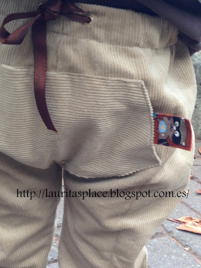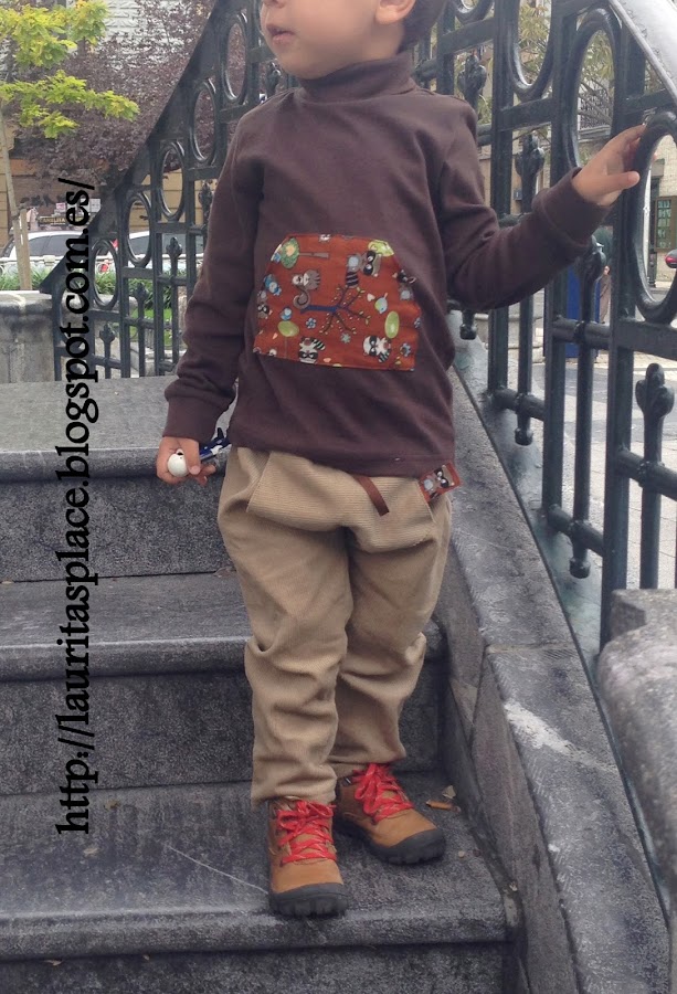 La talla es muy acertada, aunque para el próximo que cosa le voy a quitar un poco en los laterales desde la rodilla hasta la cintura porque mi peque es delgadito y quizás un poco menos ancho le sentaría mejor. Utilicé un retal de pana en tono marrón claro que tenía comprado de mi visita, hace tiempo ya , a La Coruña.
