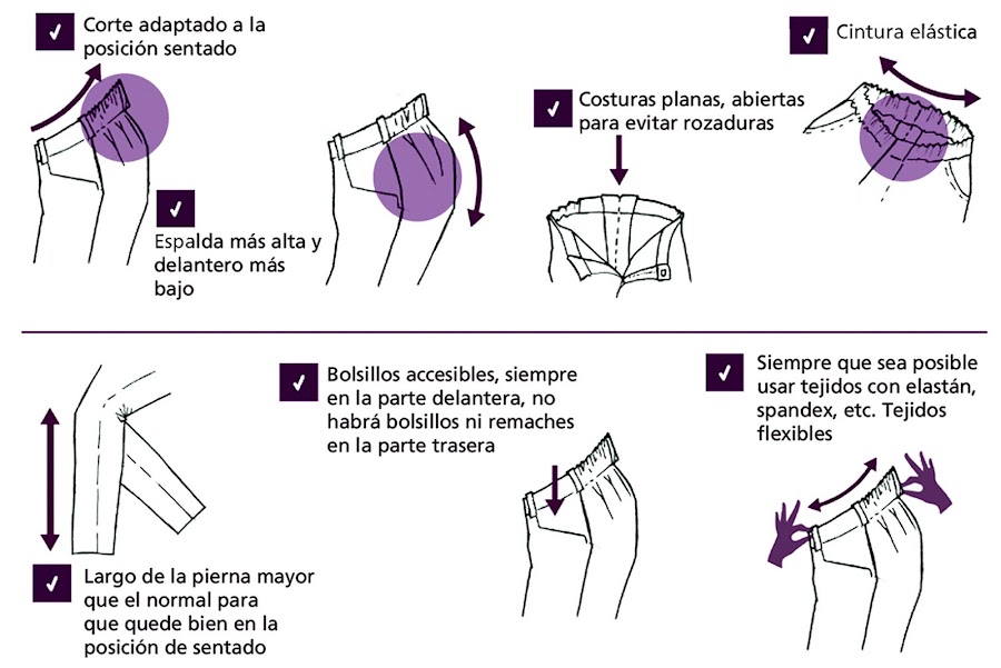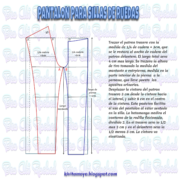 Este modelo tendra considerables diferencias con el trazado de un pantalon comun, debido a las exigencias de su uso. El patron trasero sera mayor en su ancho y su alto. Para esto se le restara al 1/4 de cadera del patron delantero 3 cm que se le adicionaran al trasero. Sobre estas medidas se haran los calculos de los tiros respectivos. En la zona de la cintura de el centro del trasero se elevara 12 cm ( 8cm para niños) , y esto hara que el patron se incline hacia el lateral. En el delantero por el contario se le bajaran 3 cm . Para determinar el alto de tiro tomar la medida del montante o entrepierna, a la persona que lleve puestos los apositos urinarios, ya que ocupan un espacio considerable, y se debe tener en cuenta para que no resulte incomodo el tiro del pantalon. Restar al largo total de la pierna el largo del montante para determinar la altura de tiro.La botamanga tendra la mitad de la medida de la rodilla flexionada, y repetiremos el procedimiento de los anchos. El trasero tendra 3 cm mas ancho y el delantero sera 3 cm menor. Continuar desde esa medida las lineas de la pernera hasta unir con el tiro. En el lateral colocar velcro para abrir el pantalon, tambien se puede poner velcro en el lateral a la altura del dobladillo. Evitar colocar botones o cierres ( cremalleras) La costura del tiro trasero se hara abierta para no ocasionar roce. Lleva una cintura elastizada. Solo se colocan bolsillos en el delantero o en los laterales. Es recomendable usar generos con elastano para facilitar la colocacion del mismo.