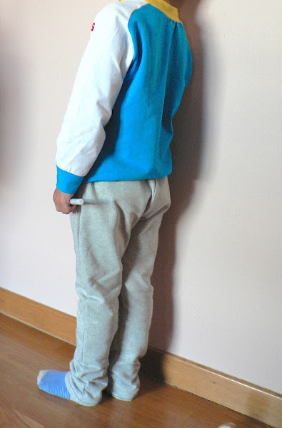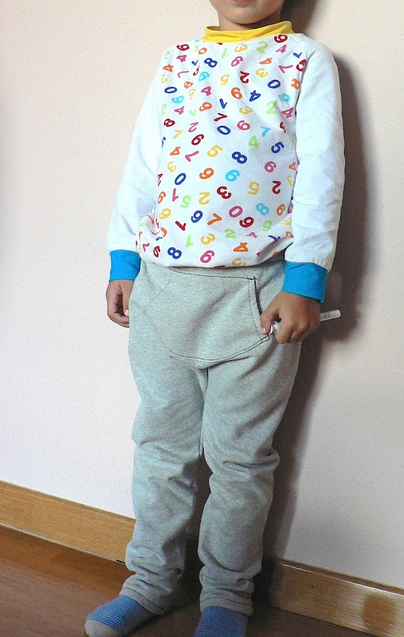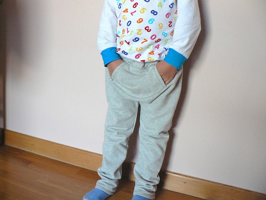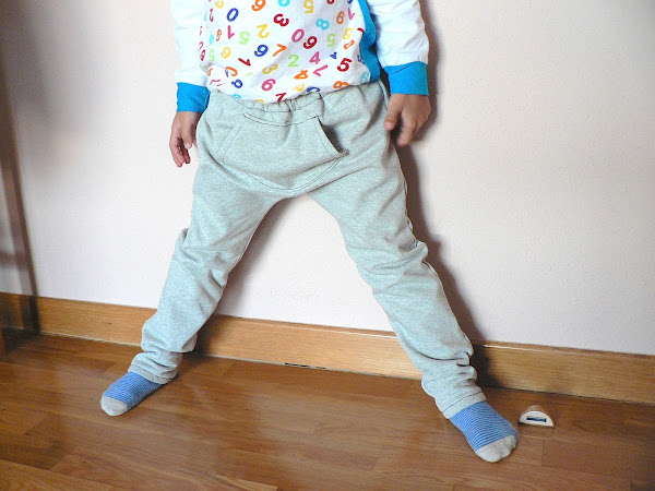 Es un pantalón holgado en el tiro y ajustado en la pantorrilla. Estilo harem o "cagao". Esto significa que se puede hacer en tela plana o no muy elástica sin que pierda comodidad para los peques. El mío está encantado con el bolsillo mágico, que metes la mano por un agujero y la sacas por el otro.